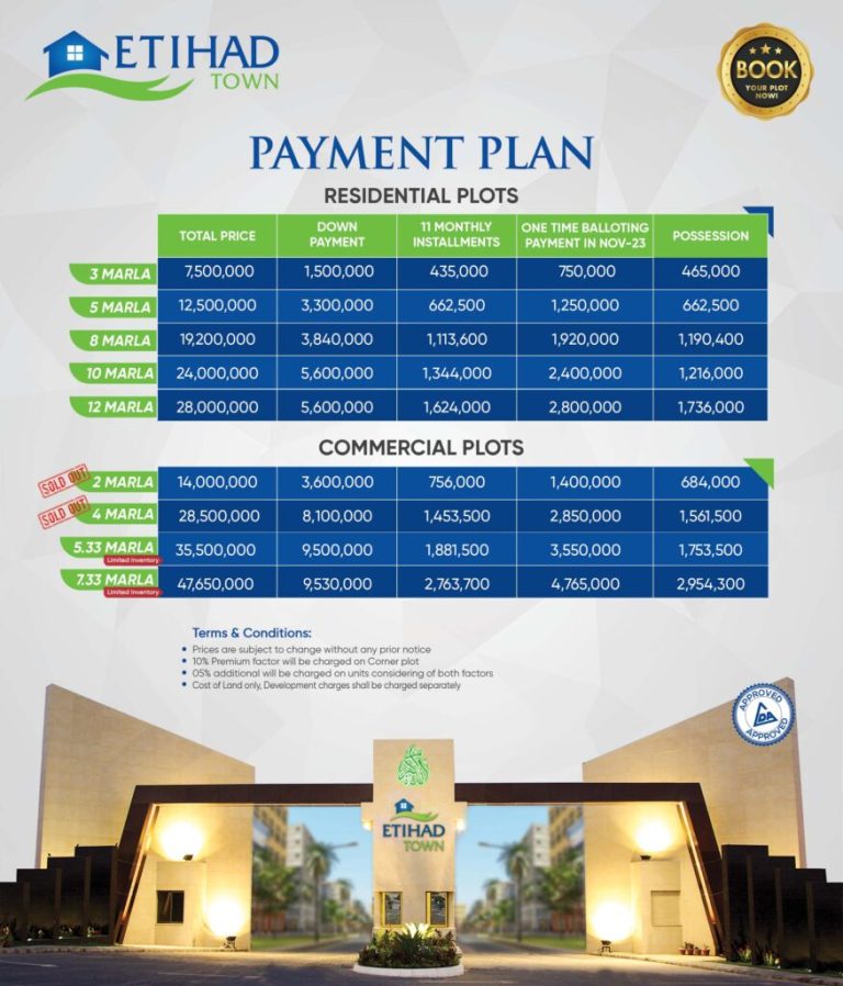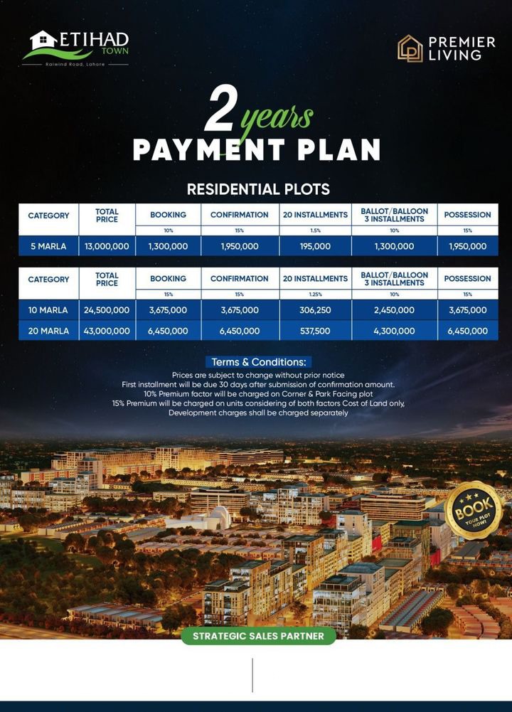 A small initial booking fee is all it takes to reserve your chosen property in Etihad Town Lahore Phase 1. This amount is much lower than the standard down payment, offering an accessible entry point into ownership.