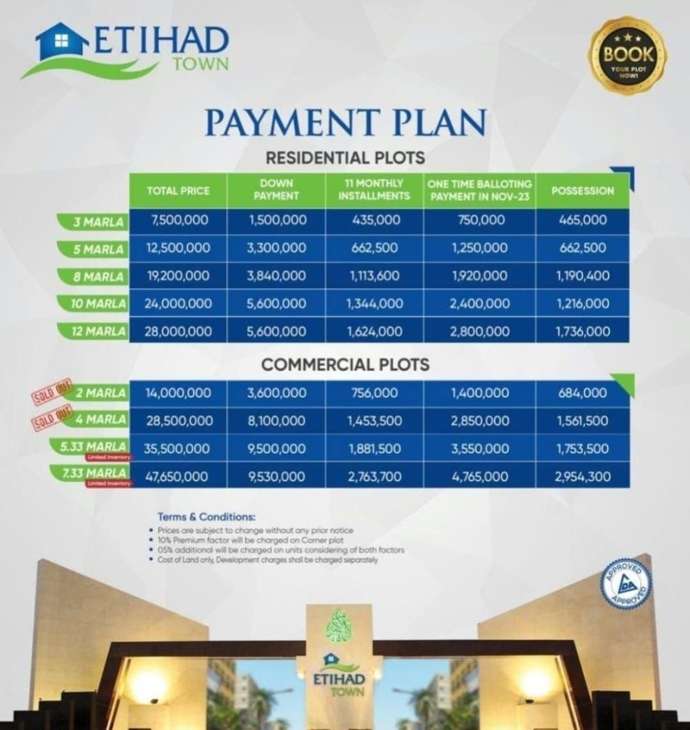 Yes, Etihad Town provides easy installment plans for both residential and commercial plots. These plans typically span 2.5 to 3 years with a down payment.