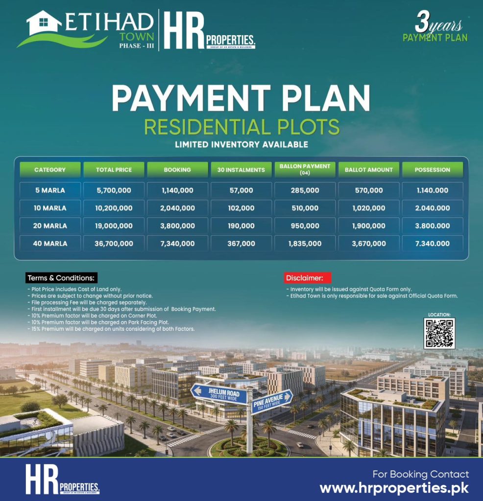 If you’ve been watching Lahore’s booming real estate scene, you’ve likely caught wind of Etihad Town Phase 3. Building on the success of earlier phases, Etihad Group returns with a new project that blends upscale living with smart investment choices. Check out Etihad Town Phase 3 Payment Plan and booking details. Etihad Town isn’t just about plots; it’s about how life feels inside. Wide roads lined with greenery. Underground utilities that keep things neat. Etihad Town Phase 3 Payment Plan is well suited for every one, families and investors.